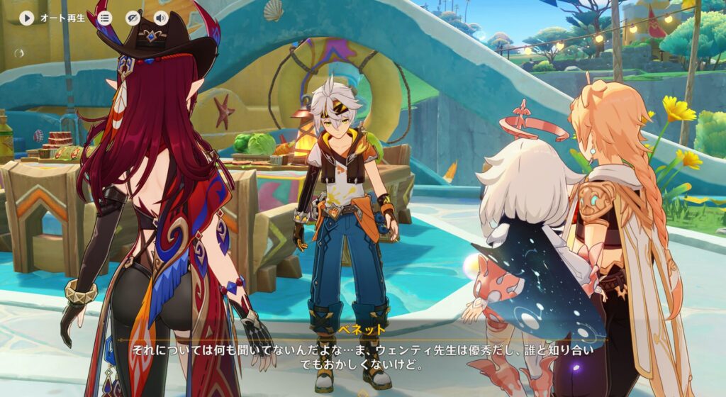 そうそう、ベネット団長がここに来た理由なんですけれど、ナタの冒険者協会が各地の冒険者をリゾートに招待していたらしいんです。それでモンド代表としてベネット団長が来たそうですよ。でもサイリュス(冒険者協会の支部長のピチT)が何故ベネット団長にそれを任せたのか気になるよな。だって団長って普段からバッドラックで有名なわけじゃないですか。下手したら道中で事故って死んでるかもしれないのに!!