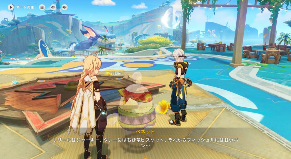 レザーくんはジャーキー、クレーはビスケット、フィッシュルお嬢には甘いパン…と色々考えてくれているみたいです。そういやレザーくんとクレーって冒険者協会の友達扱いなのか…?あるいは団長の個人的な友達といったところなんだと思います。レザーくんはマジで交友関係が全然分かんないからな。なんかクレーとは友達っぽいんだが…