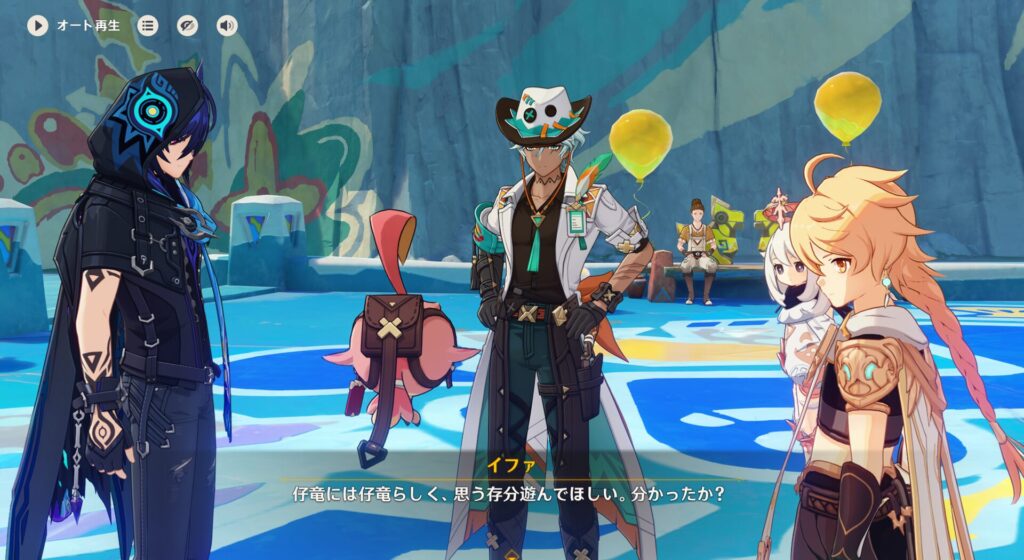 実はこれカクークと出会った記念日のサプライズだったんだって。誕生日が分かんないから出会った日をこうして祝っているらしいんです。カクークはオロルンやイファさんに対して偉そうに兄貴ぶりますが本当は遊び盛りの仔竜だそうなので、イファさんとしては無邪気に遊んで欲しいみたいな思いがあるんだとか。