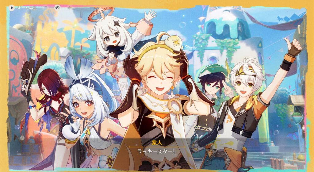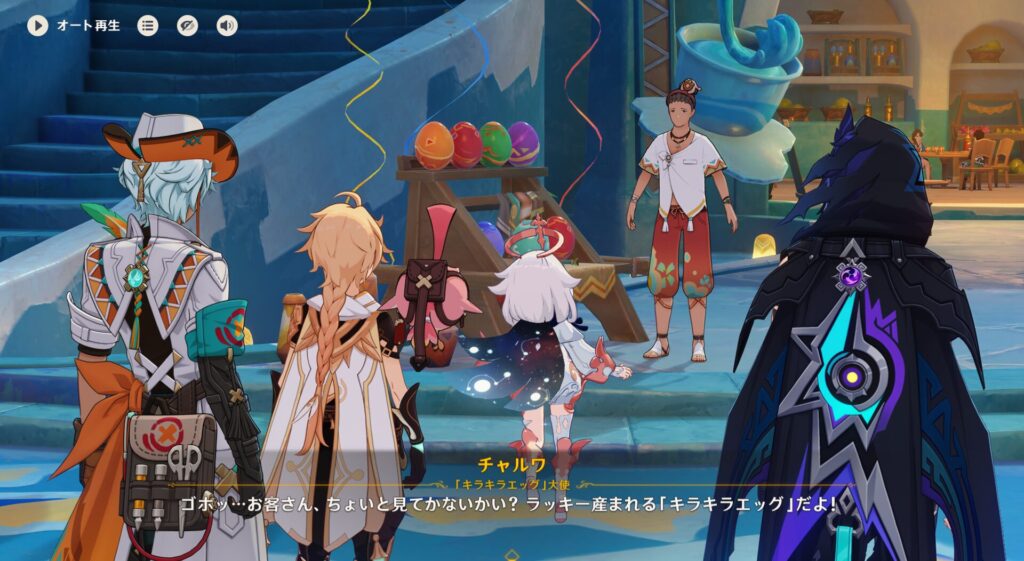 さてオロルンが独自のスタイルでガチャりましたところ、花翼の集の「高らかな歌声」というのが当たりました。キャンディだったかな?これも皆で分けました。ちなパイモンはミステリードリンク、432さんはきらきらジュエリーというのを当てました。全部食い物です。実はこのガチャ、銘菓ガチャだったんだよなwww