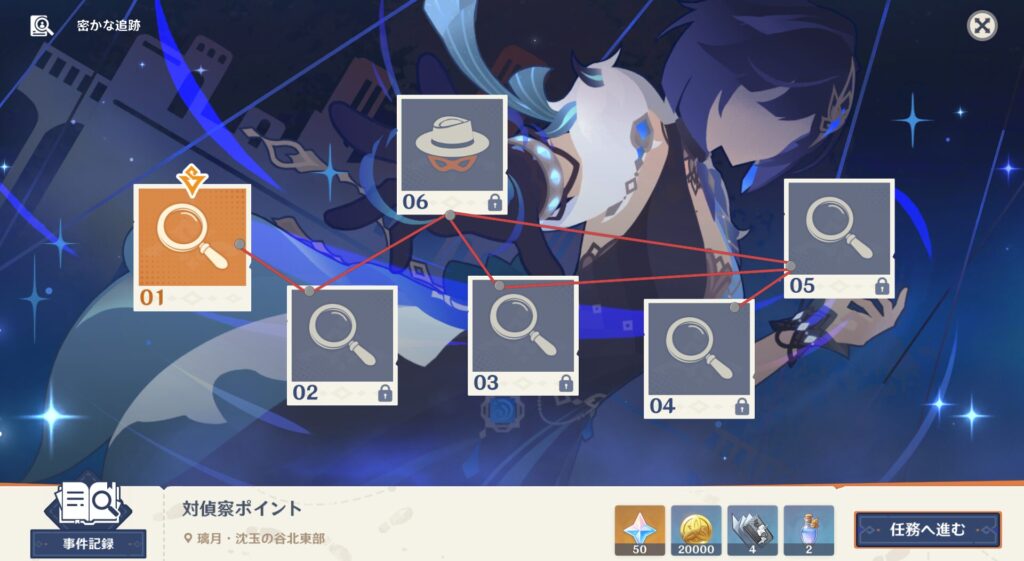 ちな、今回の件に関してはフォンテーヌの最上級エージェントがやばい任務をした時と同じくらいの報酬ももらえるそうです。マジで?!勝手についてきたのに報酬もらえるのか!そんでロードの偵察活動を逆に利用する対偵察から始めることになりました。こんな感じで手がかりを集めていくよ!