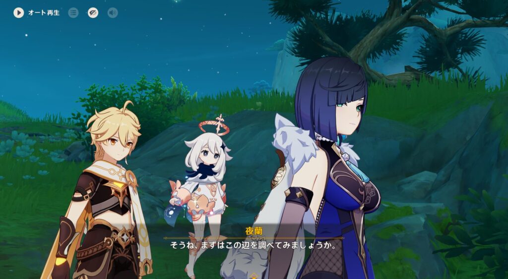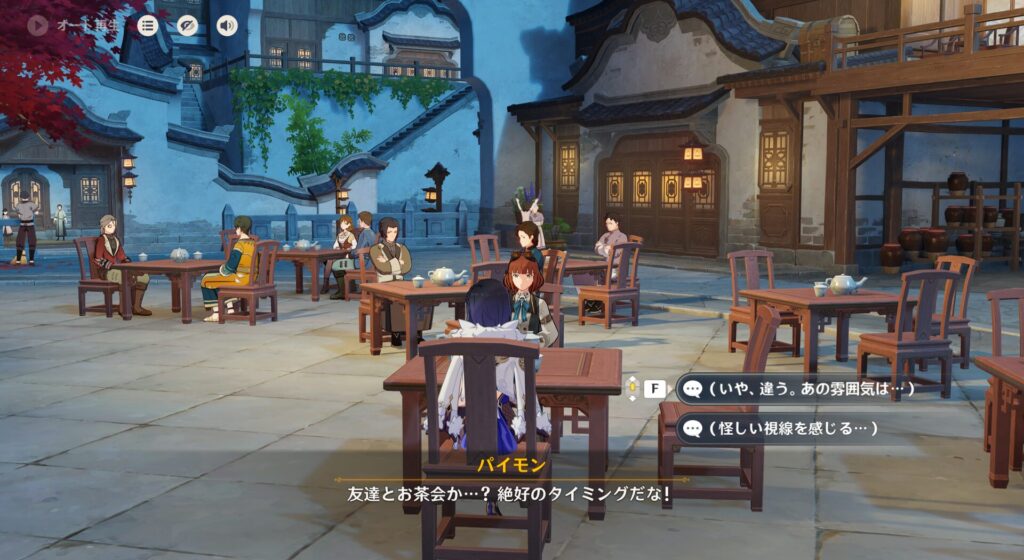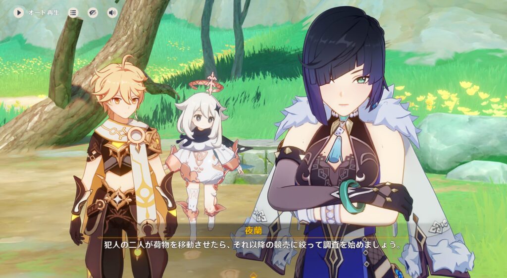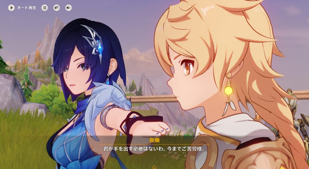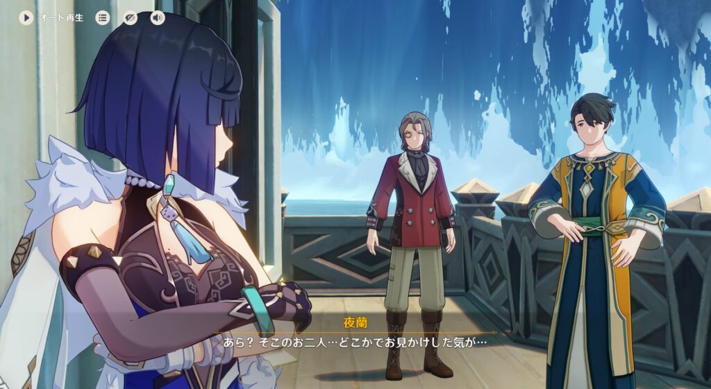 ていうか、璃月とフォンテーヌって隣国だからかちょっと関わり深いのかな?行秋の第2衣装もなんかフォンテーヌっぽいやつなんだよな。夜蘭ちゃんの衣装もそんな感じだし。それはさておき、432さん達は璃月の北の方に遊びに来ました。そこで友達と茶をしばいてる夜蘭ちゃんを発見しますが…