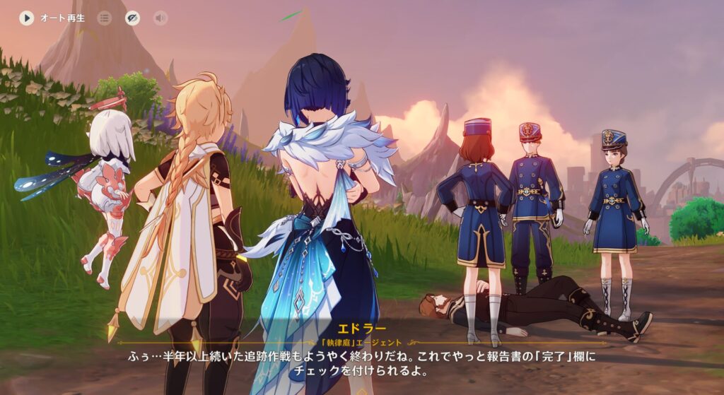 そんでエドラー捜査官が個人的なお礼として今回のボーナスの半分をくれると言ってくれましたが、夜蘭ちゃんは仕事でやったことだからと全部辞退しました。なるほど、2人とも公的組織の子だからあんまり個人的な金銭やり取りはない方がいいよね。夜蘭ちゃんは「それは旅人にあげてよ!」と言ってましたが、ぶっちゃけ432さんあんまりすごいことしてないからもらうのは気が引けるよな。ご自慢の暴力も披露してねーし……