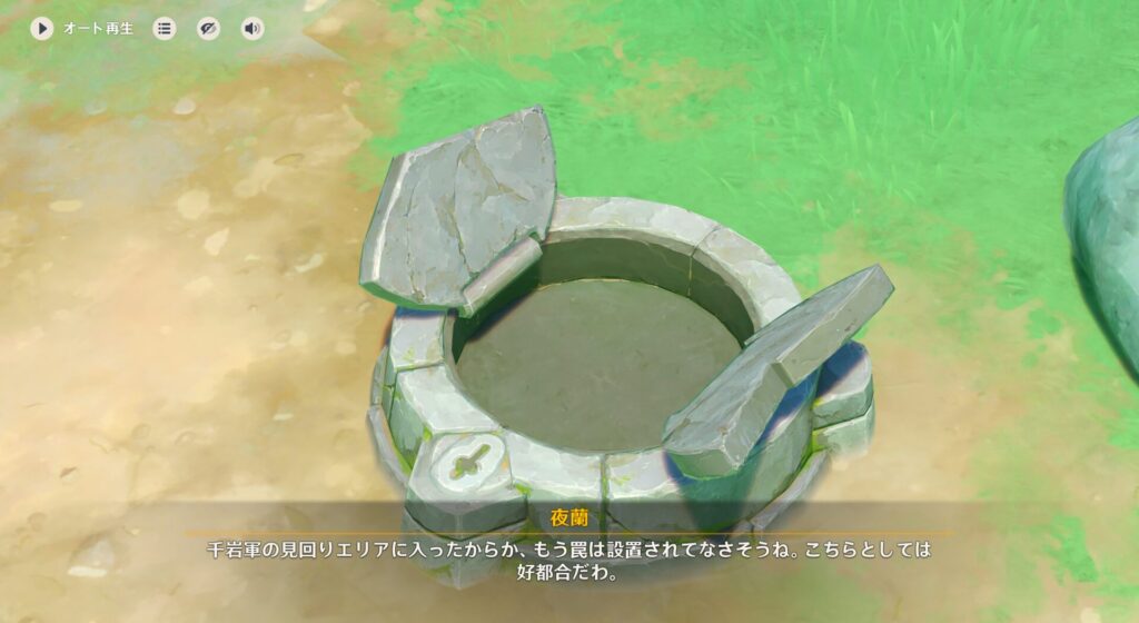 さてそんな剛力ゴリラと愉快な仲間たちをうっかり連れてきてしまった夜蘭ちゃんの方針ですが、今は「餌まきに使う餌が欲しい」とのことで、早い話がロードの収集品が欲しいそうです。現物を押さえてしまうということでしょうね。で、やって来たのは町の外です。沈玉の谷は重要な地域らしく千岩軍が灯台を置いて普段水域の見張りをしているんですが、通信手段として光信号というのを使っています。