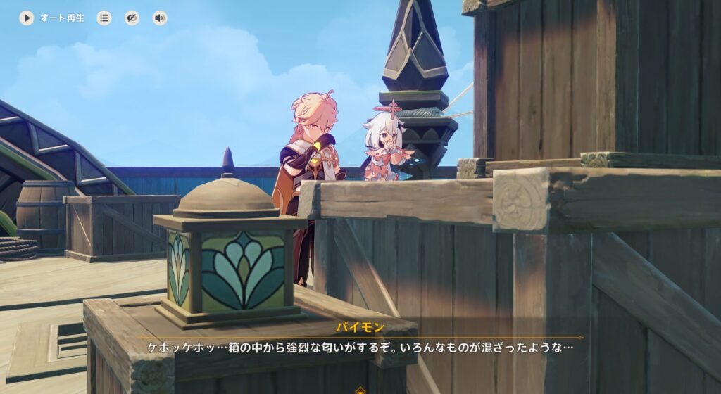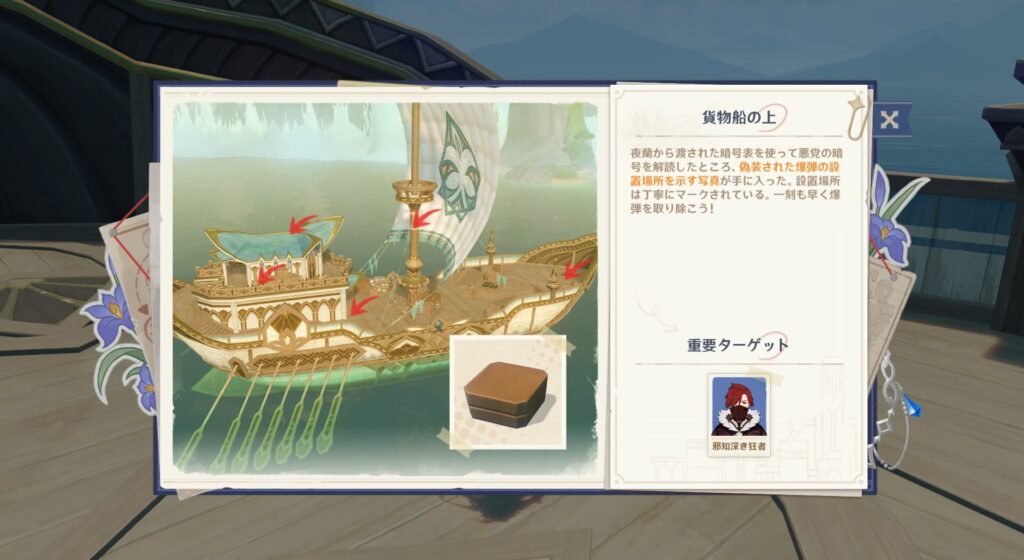 どうやらこれ爆薬らしいです。どういうことかと言いますと、まず璃月やフォンテーヌに悪行がバレて足がつきそうということを向こうも察知しているらしいんですね。つまりこの船を爆破して貨物を海底に沈め、警察の目がこっちに向いた隙にボスのロードは逃げるとかいう流れみたいです。じゃあ爆弾探さねーと!この船、確か一般客も乗ってんだよな?!