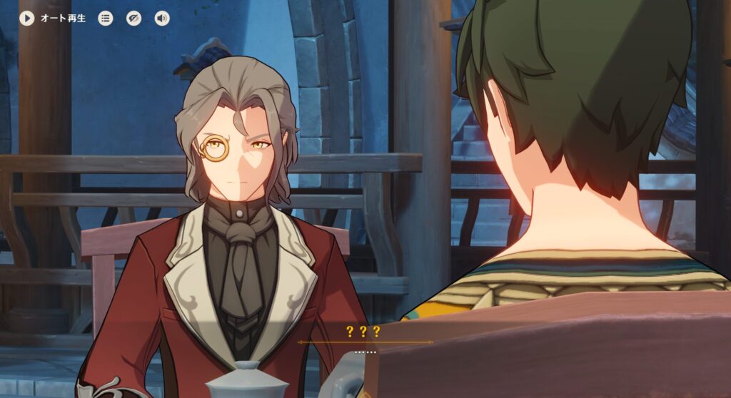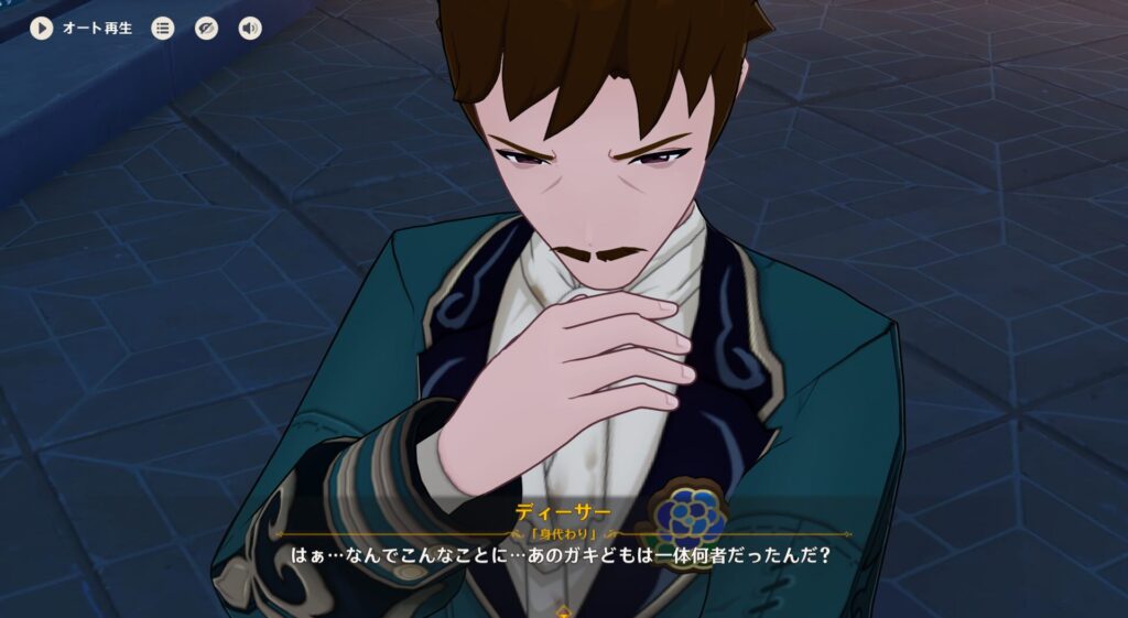 で、さっきの不審おじ2人はロードの腹心だったので、あいつらを尾行してロードをしばきに行っちゃいましょ☆って感じの作戦になっているようですね。ちな、爺の方がフォンテーヌの骨董品協会の幹事コーダー、若い方がスメールの貨物船船長ドッダマーニです。