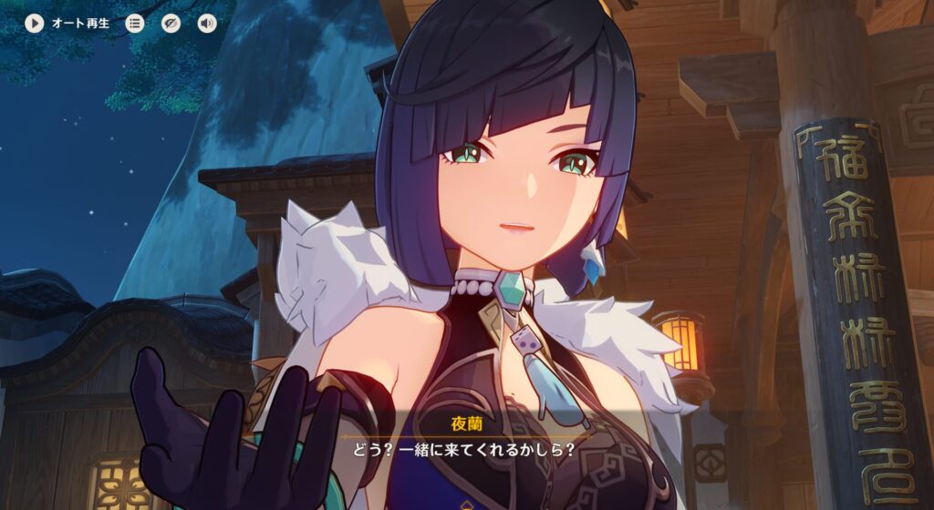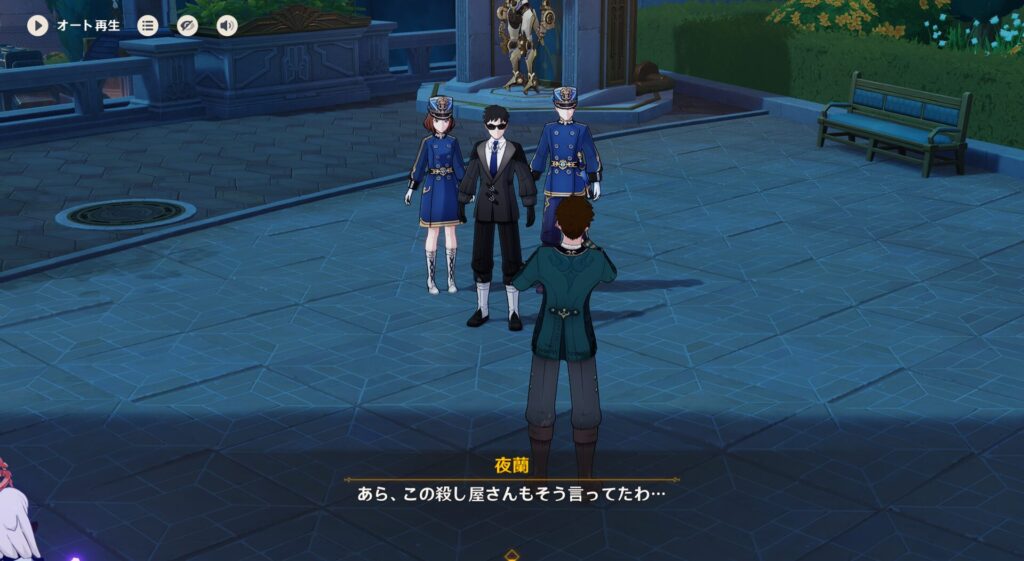この2人は璃月から安全に船を出したいためエドラー捜査官を尾行している、ということを夜蘭ちゃんは把握して尾行しようとしているんですね。スーパー先回りです。そんでわりと軽いノリで「一緒来る~?^^」と聞かれます。