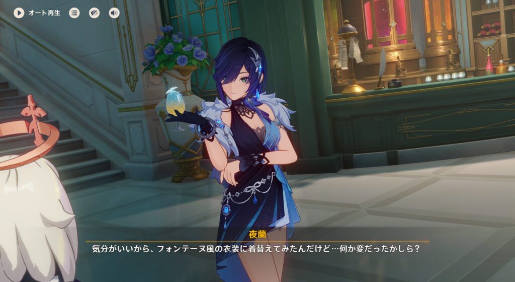 もう夜になってしまっていたんですけれど、カブリエール商会でこの新衣装に合う香水を選んで欲しいと夜蘭ちゃんから言われましたね。え、432さんそんなプレイボーイみたいなことできんの?!というか、気のせいかもしれんけど432さんって大人のお姉さんとよくデートイベント起きるよな?!リサさんの伝説任務もそうだったし!