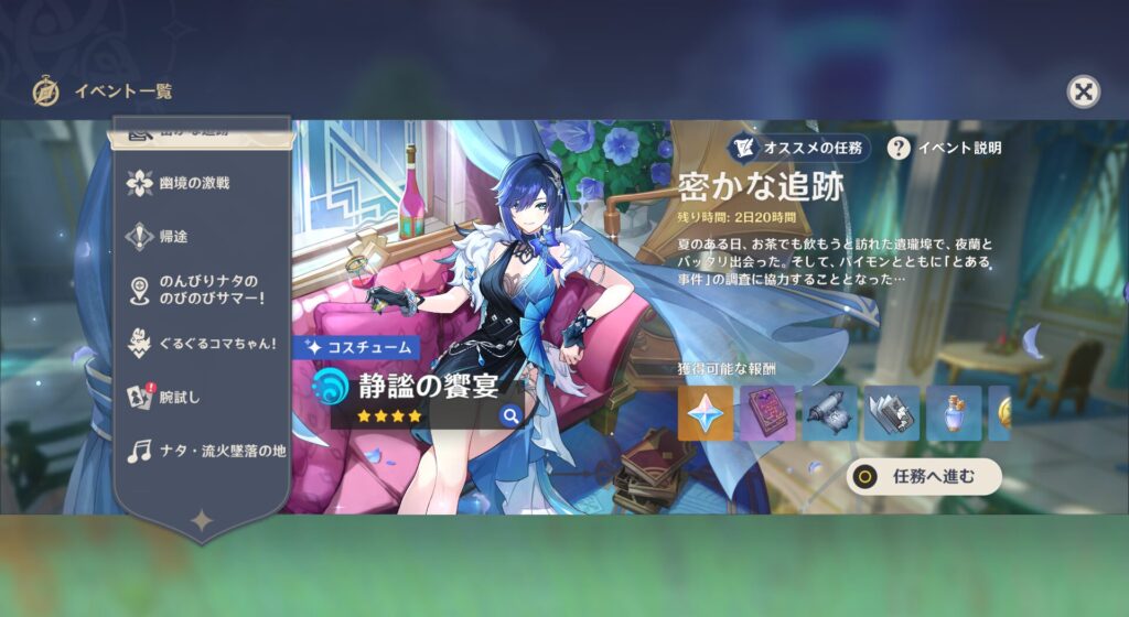 なんと璃月の凝光お嬢様の部下であるくのいち、夜蘭ちゃんのイベントですよ!おおお!あの子めっちゃ可愛いから是非とも知り合いになりたいと思っていたんですよね!しかも新衣装出るってよ。この子お迎えしてねーから衣装あっても仕方ないんだけど、なかなか美しい衣装です。