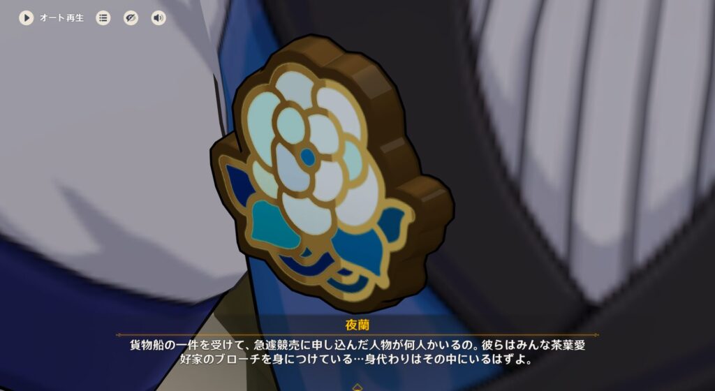 さてこの拠点、中には磁器や花瓶、茶葉などがあったそうでそれが競売に掛けられる品のようです。夜蘭ちゃんはそれを全部メモりました。ですが、これだけだと犯人がどの競売に出るのかまでは分からないらしいんです。フォンテーヌの競売ってめっちゃやってるんだって。