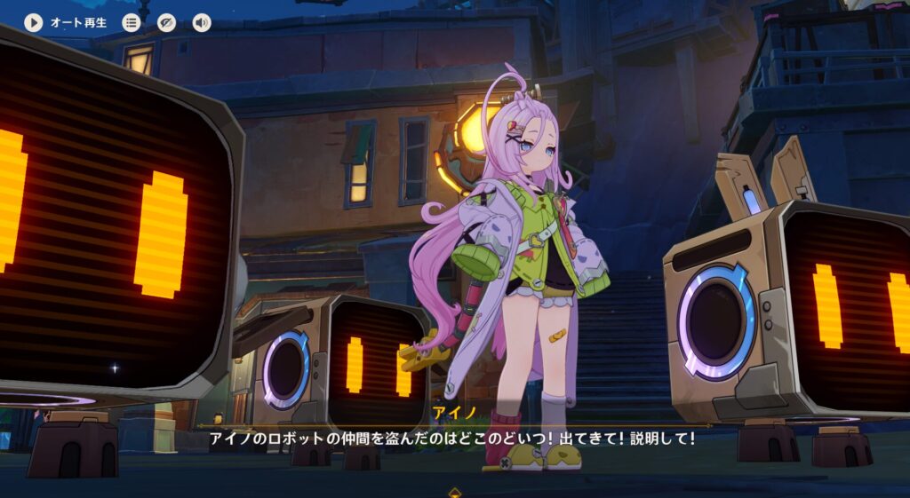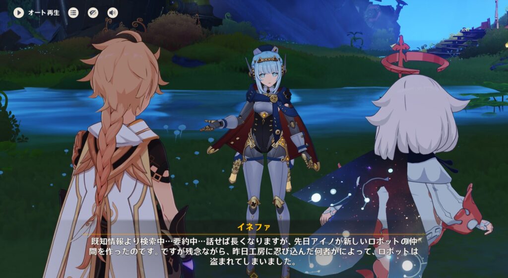 どうやら事の始まりはこの工房の新作ロボが盗まれたことだそうです。で、今現在制作者のアイノ(イネファちゃんの製作者)がそれを取り返そうと容疑者を片っ端から当たろうとしているらしいんですよ。それを止めて欲しいというのがイネファちゃんからのお願いです。