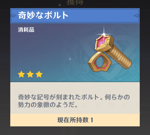 何らかの勢力の象徴って書いてあるんだけど、ハート型みたいな形の印章もってる勢力を知らないのでおそらくまだ未知の勢力の話なんだと思います。これイネファ関係で拾ったかもらったかした奴じゃなかったっけ?と考えるとイネファの製造元の印章ちゃうかなあ…
