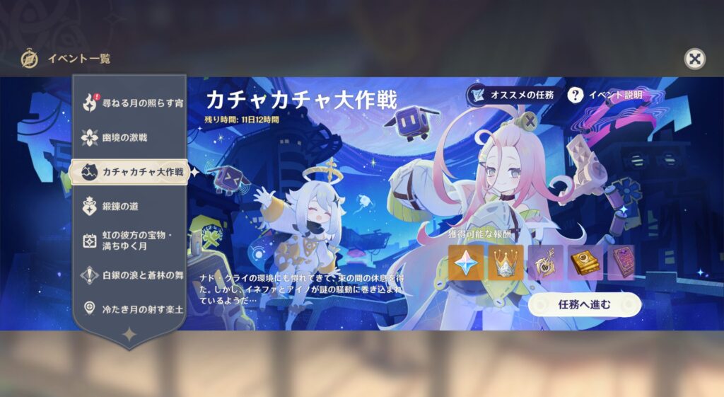 というわけでちょろっとしたデイリーのメモも終わりまして…ナドクライのイベントに入っちゃうぞ!イベント名はカチャカチャ大作戦といいます。実はこの前ゲットした戦うルンバことイネファちゃんに関わりのあるイベントなんですね。だからやっておきたかったんだぜ!