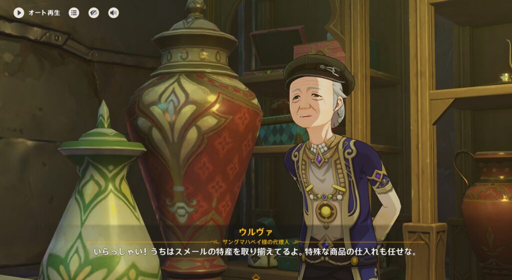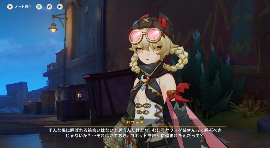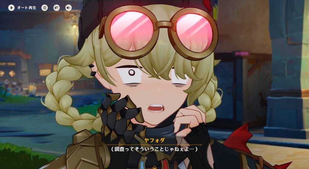 こちらはヤフォダといいまして、ボスの知り合いのトレジャーハンターだそうです。432さんやパイモンとも知り合いですが、ボスからは「ガラクタ拾い」と暴言を吐かれていました。ボスたまに酷いよなwww