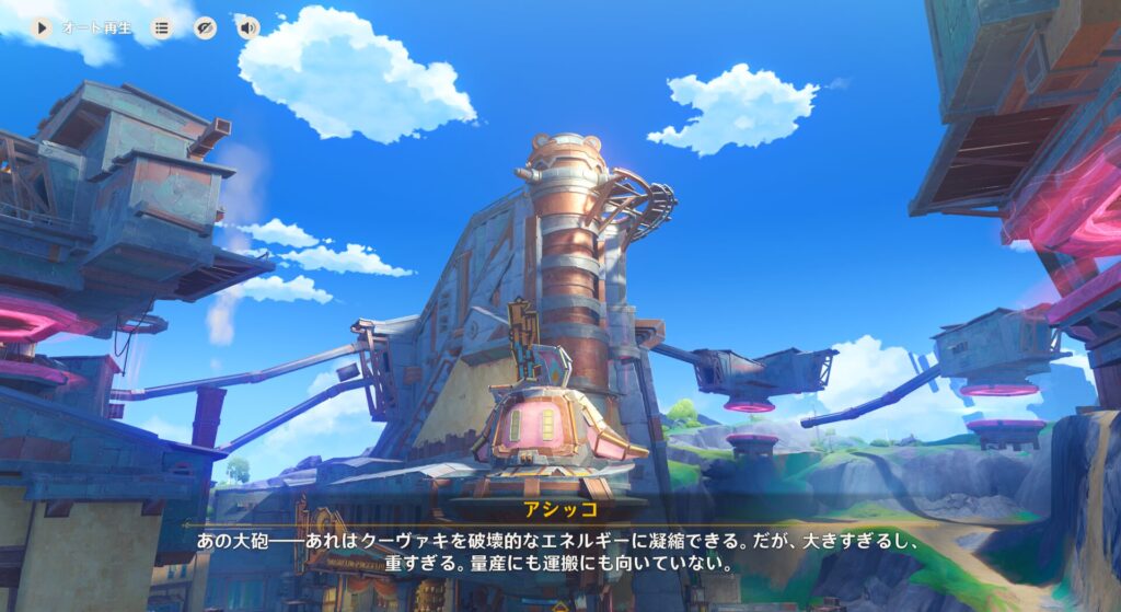 この大砲はクーヴァキを破壊エネルギーに凝縮し、すげえ火力を出します。アシッコはこれを商品化しようと考えているようです。ただ、このドッカン砲はサイズがでかすぎるんですね。しかもリロードにすげー時間がかかります。だから小型化して量産して儲けようとか思っているらしい。