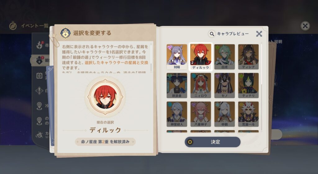 なんかこれ手元の恒常☆5が凸できるシステムなので早速ディルックさんを凸ることに。