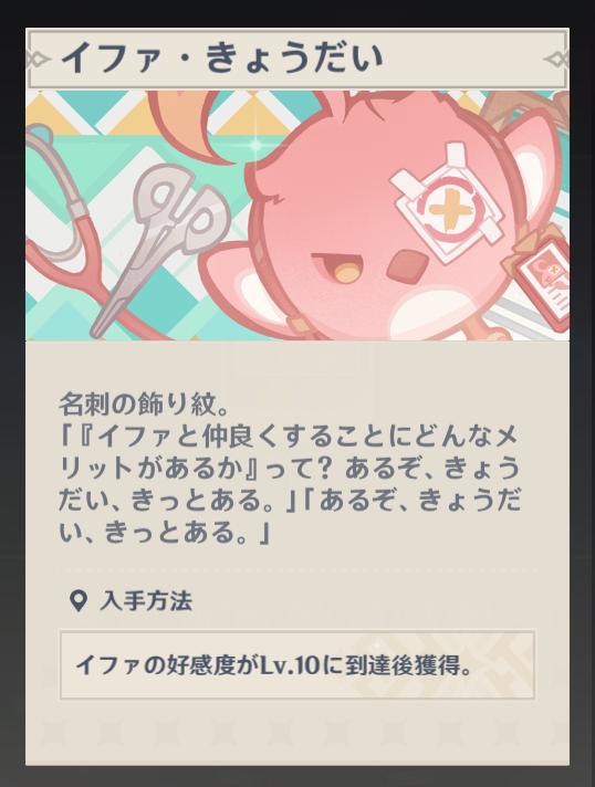 かっわいいな……!そんでイファさんと仲良くするといいことがあるらしいぞ、きょうだい。いやフツーに考えて地元で有名なドラゴンのお医者さんなんだから地元民にとってはメリットしかないでしょうね。まあイファさんもイファさんで怖いはところあるんですけれど…プロフィールで大した情報が出てないって逆に後から怖い情報出てくることあるんだから!!※当ブログではその現象をガイアの法則と呼んでいます。