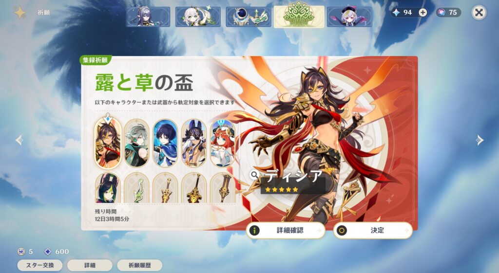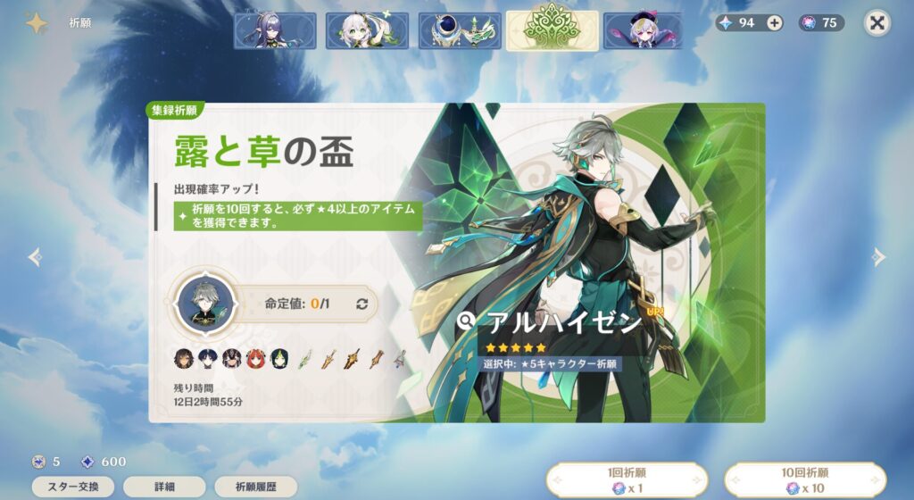 さて、ここからが本題です。実は今回、スメールガチャを引くことにしたんですよ。というのがですね、アルハイゼン氏っていう学者系男子が草系で結構強いらしいんです。アタッカーの草が欲しいんです…!