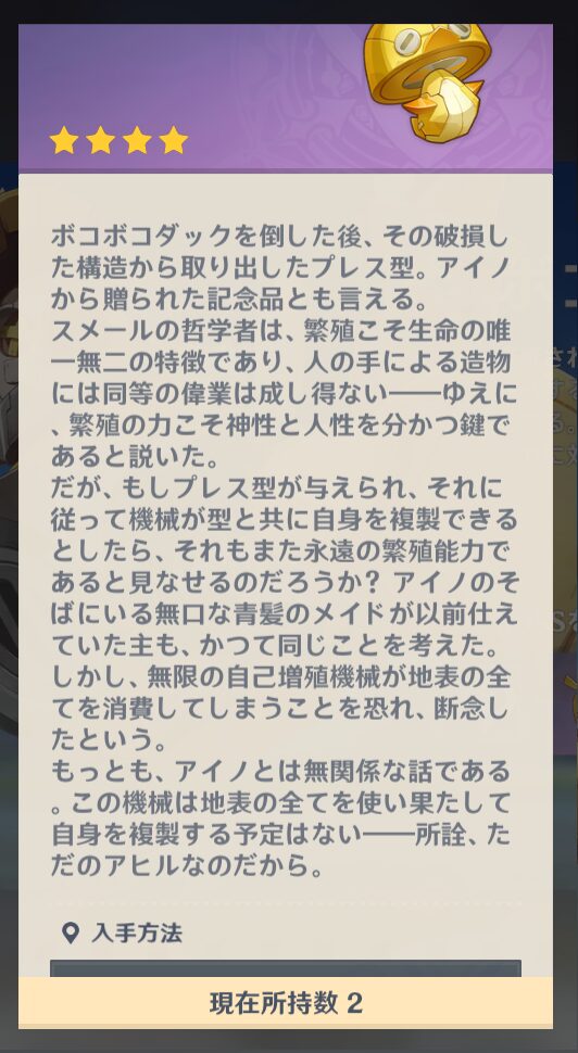 スメールの哲学者は生命の特徴は繁殖であり、人造物には無理だよね=繁殖こそが神性と人性を分かつ何かのヒントだと思った。でも機械がプレス型で自己複製したら繁殖してるって言えるくない?イネファちゃんが以前仕えていた主も同じことを考えていた。でも無限のコピー能力が地表の資源を食い尽くすのを恐れてやめたという。