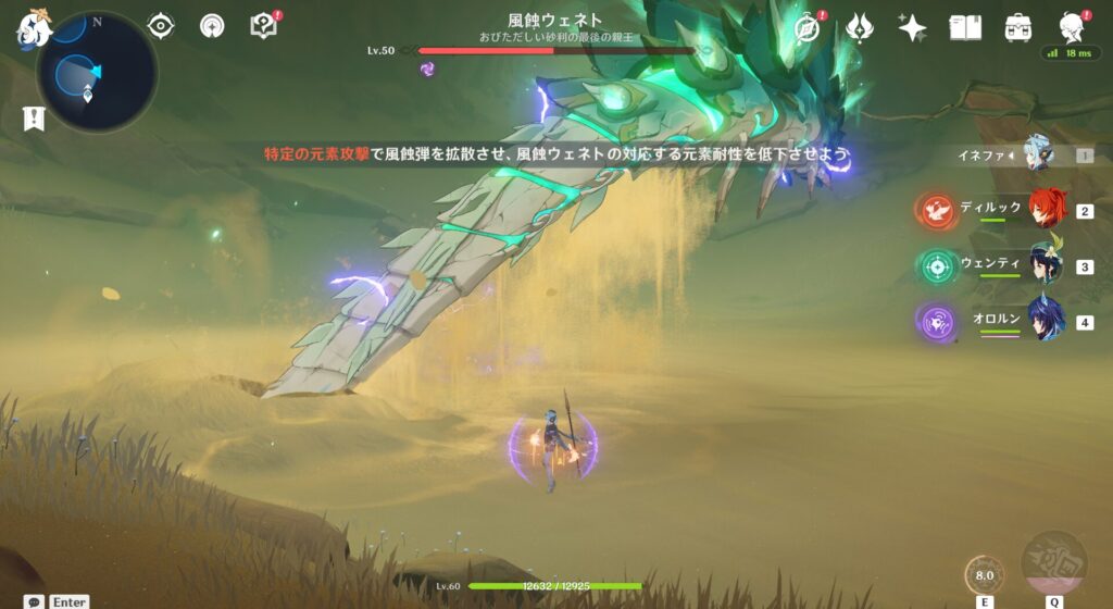 サンドワームみたいな何かでして、地中に潜んでいます。これ初見だと結構怖いぞ!!まあ頑張ったら倒せるからいいけれども!ちなみに属性は風っぽいです。風蝕ウェネトとかいう名前をしていました。最終的にギャラドスのように空中に浮くんですけれど、風攻撃ないと撃墜できねーめんどくささがあります。