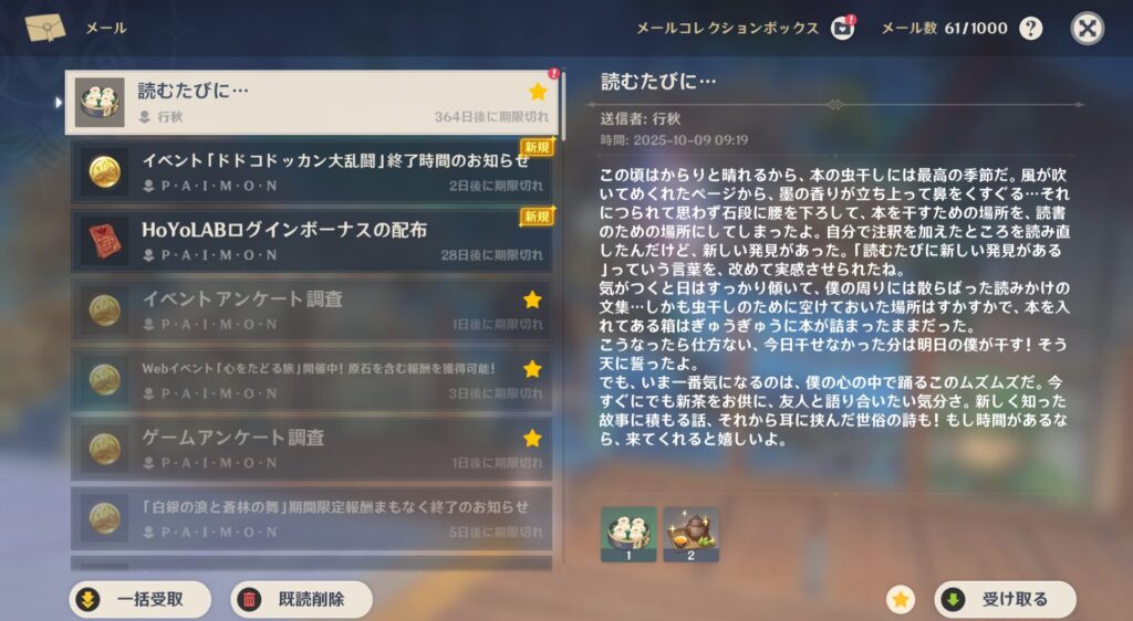 なんか「片付け中に見つけた漫画読んでたら1日が終わってた」みたいな親近感のあることをしていました。微笑ましいですね。そういえば行秋と蔵書家のところに遊びに行くみたいな話あったよな。それも行きたいんだよ~!