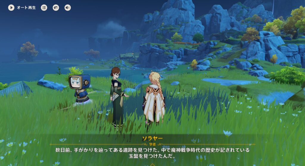 まずこちら、璃月の山の中でお宝を探す宝児っていう女子のお手伝いをしてあげるというデイリーなんですが……ある時、そのデイリーをしていたら宝児がいなかったんですよ。で、代わりにこちらのスメールの学者のソラヤーさんという方に会いました。そんで魔神戦争時代の歴史が書かれた玉盤がこの近隣で見つかったという話をされます。