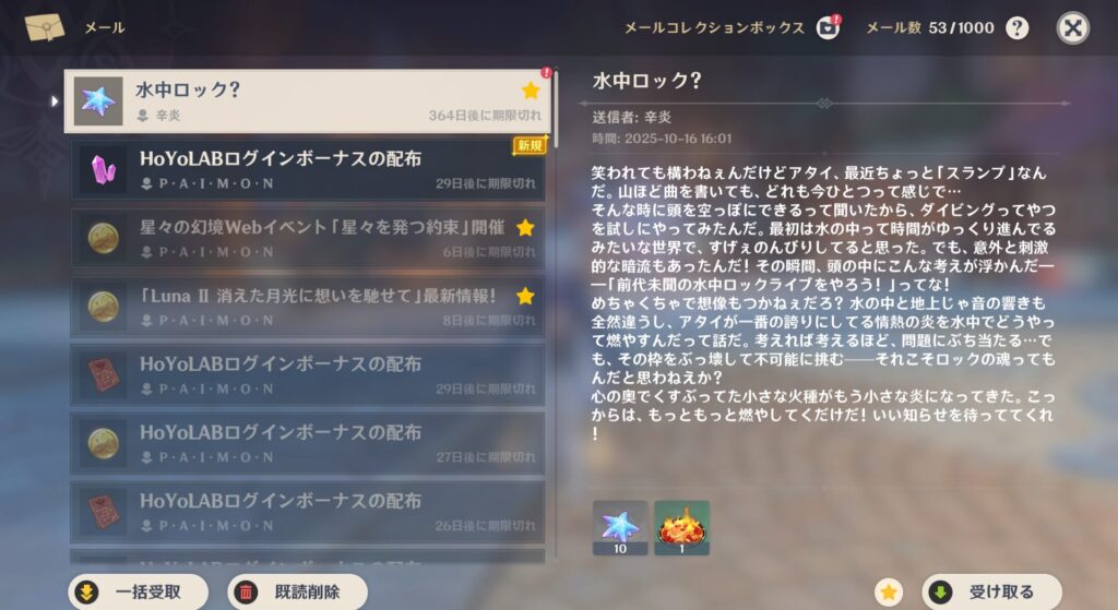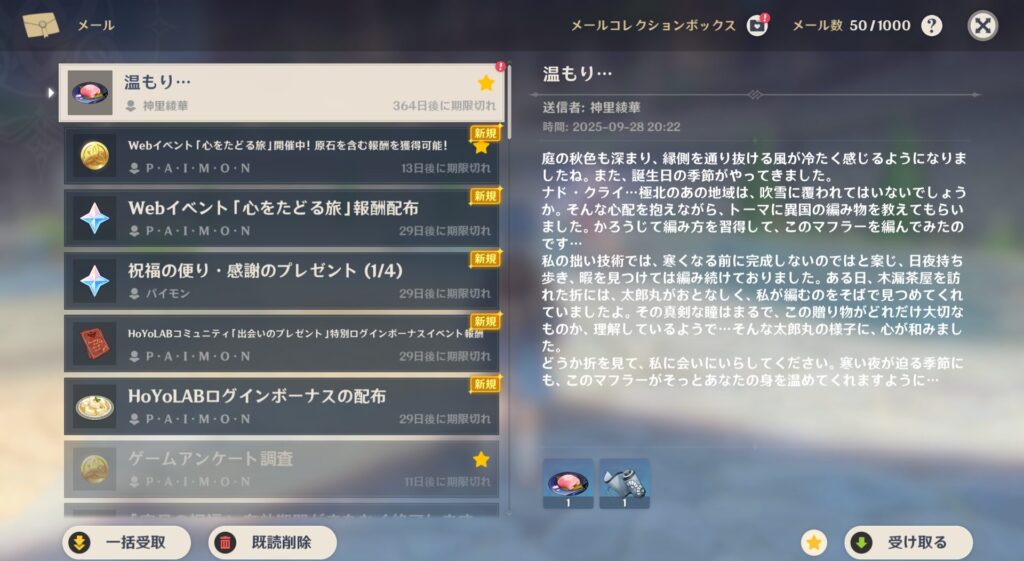 実は原神を開始して1番最初にバースデーメールをくれたのが綾華だったんですよ。で、当時はそんなシステムがあるということを全く知らないので、名前と文章の雰囲気からメンヘラの元カノに僕のIDがバレたのかと思ってすっげー冷や汗かいたんですよね。懐かしいぜ…!
