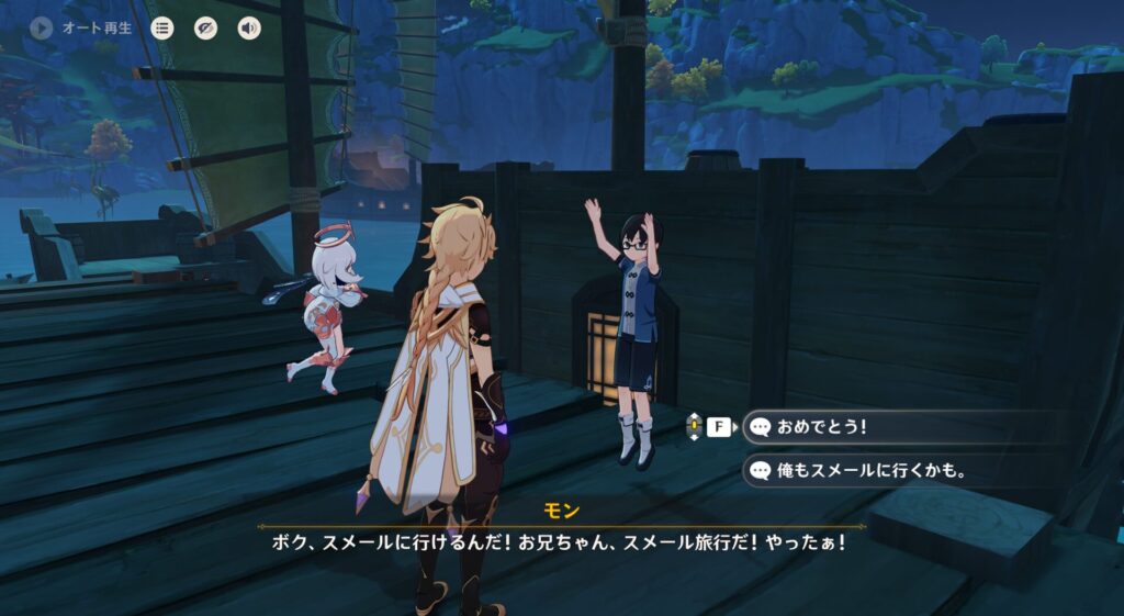 で、このイベント進めますとモンくんはスメール旅行に行くことが決まります。翹英荘という璃月の有名なお茶の産地にも行くんだって。良かったな!楽しんでくるんだぞ。