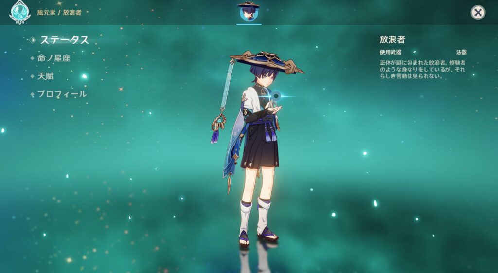こちら、放浪者といいます。職業じゃなくて名前が放浪者なんです。しかもスメールガチャに出てくるのに、服はどう見ても稲妻系…なんかコイツだけ明らかに異質なんですよね。