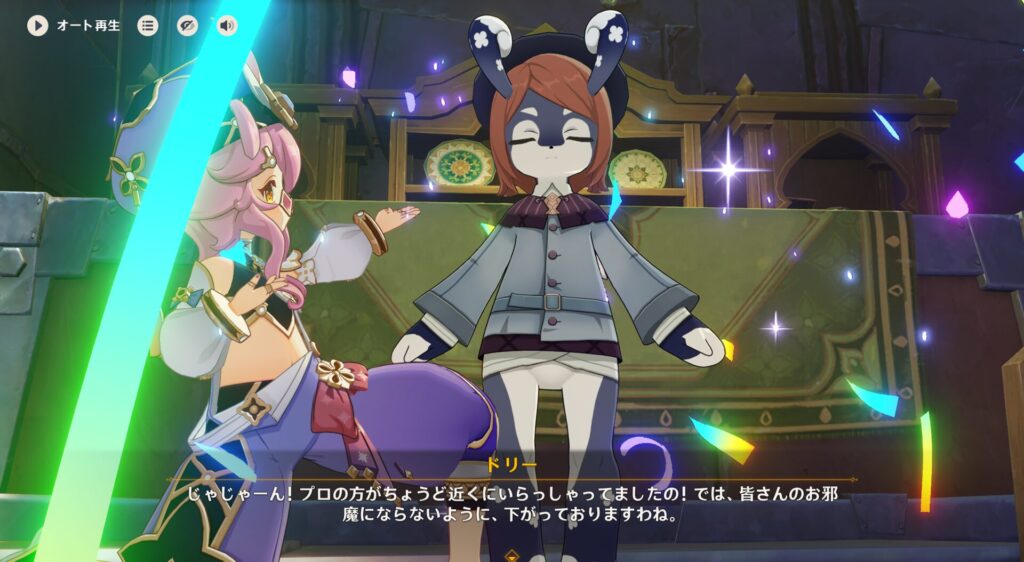 このドリーさんはですね、カルカサルザライスパレスというところに住んでるスメールの大商人でして、ありとあらゆる商品を取り扱っているそうです。ちな字面では伝わりにくいですが、すっげー独特の喋り方をします。あの、お●りかじり虫の声優がテンション高い時みたいな喋りする……