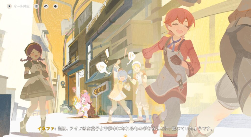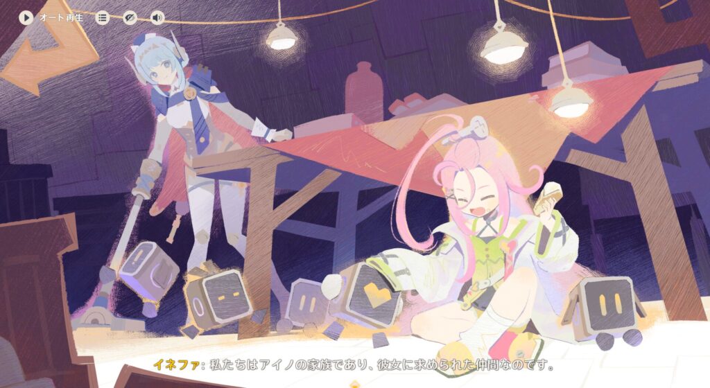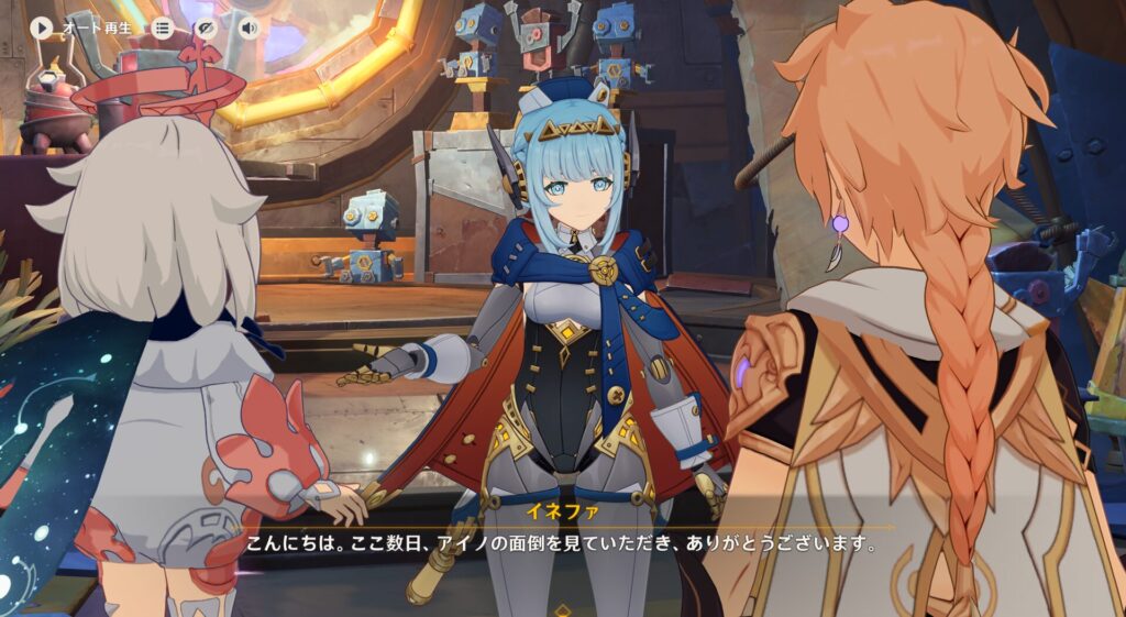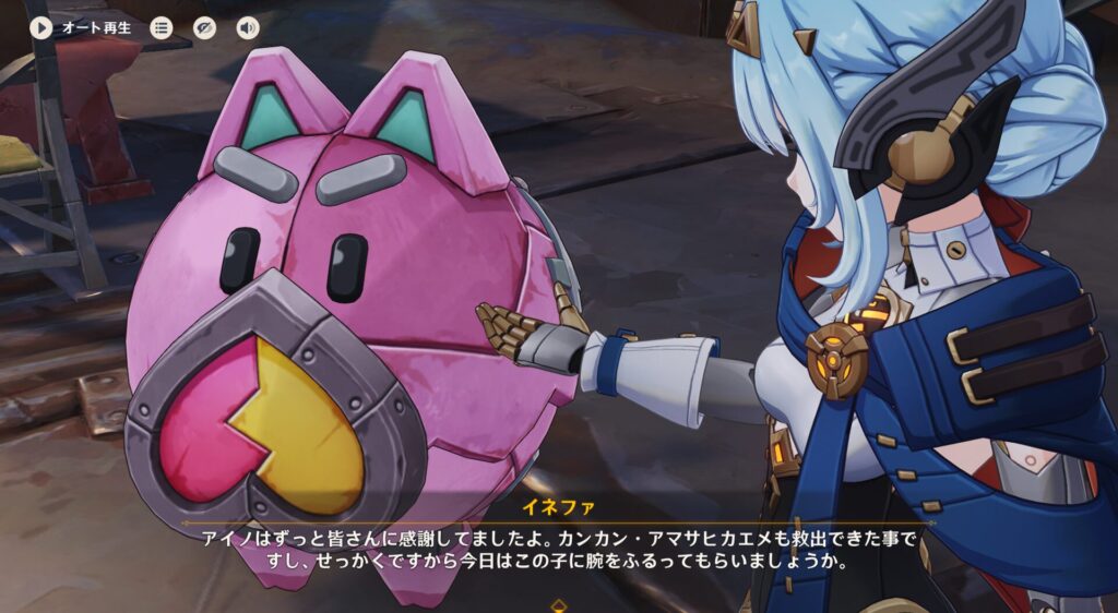 前回はリオセスリニキの腕を犠牲にナドクライに乗り込みまして、イネファちゃんのボスであるアイノさんに会いに行ったところ工房のロボットが盗難に遭っているということが判明しました。それだけでもまあまあ大変なんですが、そのロボっていうのがどうやら核兵器レベルの火力を出すことも可能なパーツだかシステムだかを積んでるホームベーカリーらしく、色んな悪人に戦争兵器として狙われてしまっているようです。何をどうしたらホームベーカリーにそんな機能が搭載できるねん。
