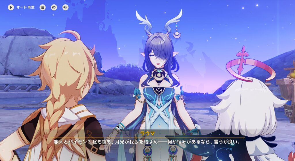 そういやナドクライってケルトみたいな感じとか言うてたな、カニ味噌さんが。神秘的な感じの場所ですね。そんで423さんたちはここの族長だか祭司長だかのラウマさんと知り合いです。正式名称は詠月使と言いまして、古い血筋を持っているそう。あの角は重い伝承の象徴とのことです。