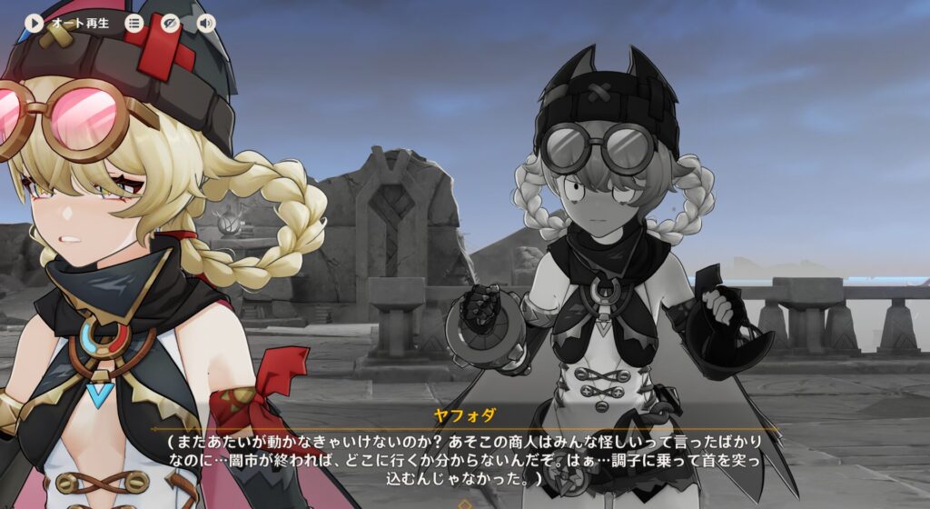 で、このセディルちゃんですが所属はマレショーセ・ファントムというところだそうです。多分ポリスかな?そこのメリュジーヌが今密輸事件の調査をしていまして、担当の子がナドクライから帰ってこないので休暇中の彼女が心配して見に来たらしいですね。ていうか、フォンテーヌってこの前も密輸起きてなかったか??あそこ法治国家のわりに事件多いよな…いや、法治国家だから検挙率が高いのか…