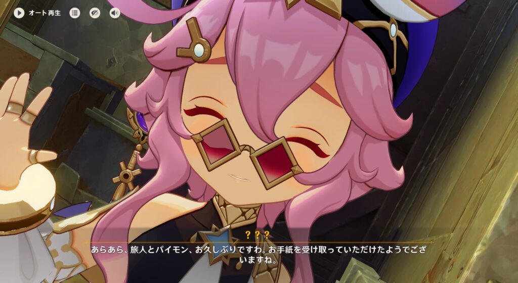 どうやらこれ、ドリーさんというお友達からの手紙でした。ただ、432さんやパイモンはそんなにいい印象を持っているわけではなさそうなので多分クセが強い人なんだと思う。でも何か手がかりがあるなら見に行こ!ということで行くことにしました。その432さんのお友達のドリーさんがこちら。