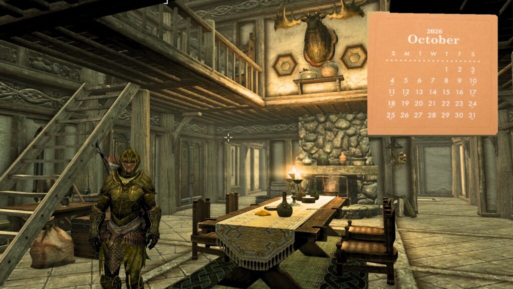 うちはそもそもゲームブログでして、ゲーム内でナイスなスクショを撮っては毎年こうしてカレンダーにしているんですよ。こちらはスカイリムというゲームにおける自宅ですね。相棒のイケてる脳筋エルフを撮影しています。