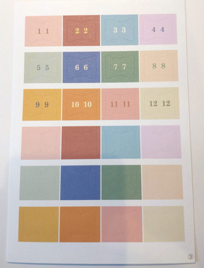 これを印刷した画像に貼り付けて卓上カレンダーを作成しているわけです。そんでこれ、てっきり6色くらいを2回使いまわししてんのかと思いきや、12ヶ月全部色違うんだよ…すごくないか?!しかも色のチョイスもすげーオシャレでちょっとマットな色合いです。自分が目視で判断した色の名前になっちゃうけど、一覧は以下の通り。